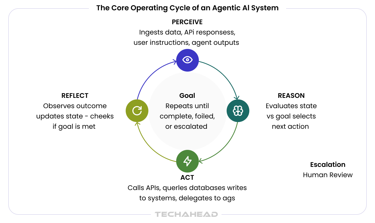 Every agentic AI system operates on a loop that repeats until a goal is achieved or an escalation condition is triggered: