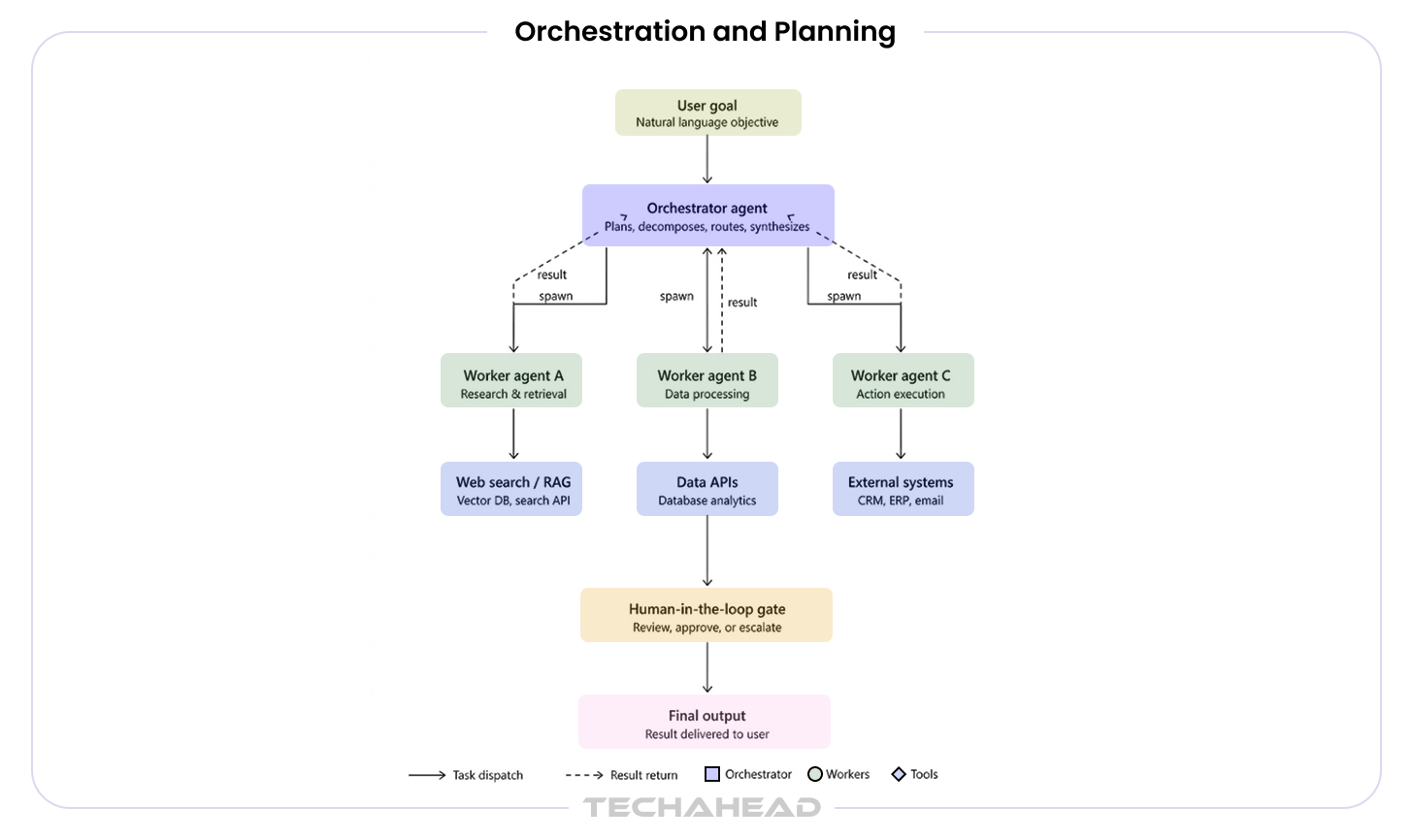 Orchestration manages how an agent decomposes a goal into sub-tasks, sequences or parallelizes execution, handles failures, and synthesizes results. In multi-agent architectures, an orchestrator agent coordinates worker agents, each specialized for a specific function. Leading orchestration frameworks include LangGraph, AutoGen, and CrewAI. Framework selection should be driven by workflow complexity, team familiarity, and long-term maintainability rather than benchmark performance.
