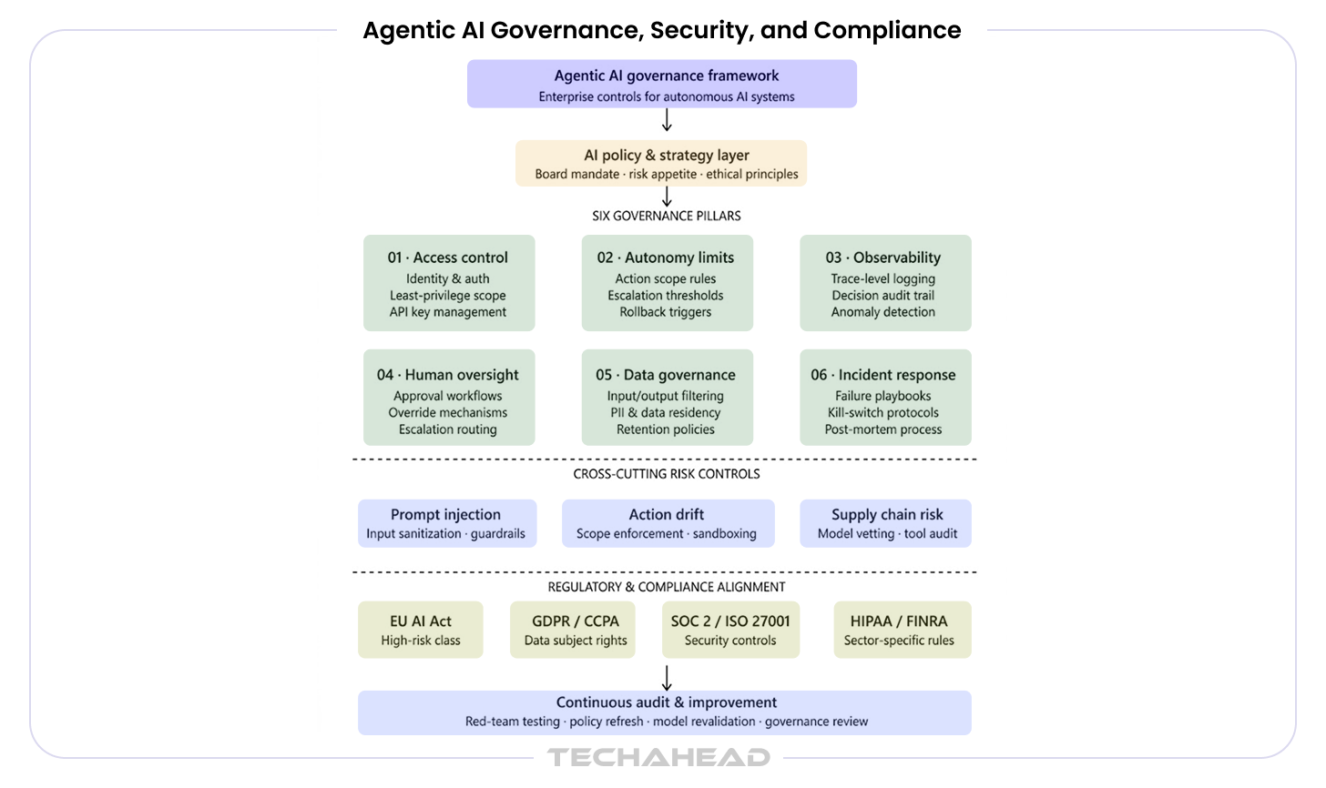Enterprise governance of agentic AI requires six controls: agent identity and access management with least-privilege scoping; action scope limits with defined human approval gates; complete audit trails of every agent action; data residency and privacy controls at the tool layer; model version control with staged rollout protocols; and tested human escalation procedures. Security controls must address prompt injection, credential exposure in multi-agent chains, and tool misuse.
