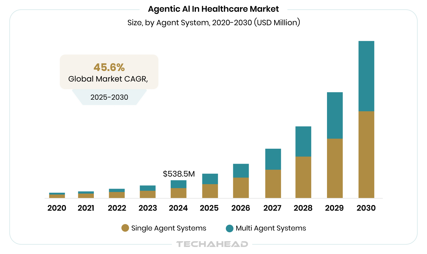 The momentum is accelerating rapidly. The global agentic AI in healthcare market was valued at USD 538.51 million in 2024 and is projected to reach USD 4.96 billion by 2030, growing at a CAGR of 45.56% from 2025 to 2030, highlighting strong enterprise adoption and investment potential.