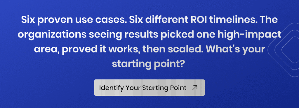What You Get: Competitive differentiation. These aren’t cost-saving measures. They’re strategic bets that your organization can deliver fundamentally better care at scale. The organizations investing here aren’t optimizing existing workflows. They’re inventing new care models that leverage agentic AI in healthcare at enterprise scale.