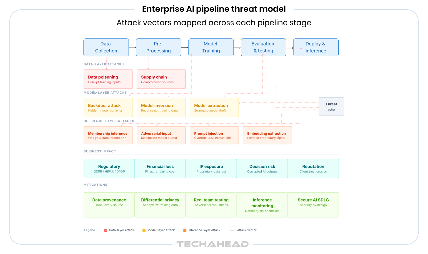 The regulatory landscape is converging fast. GDPR’s Article 83 allows fines of up to 4% of global annual turnover for data protection failures and membership inference attacks that expose whether an individual’s data was used in training, which is a direct Article 22 liability. HIPAA violations in healthcare can reach into the tens of millions. India’s Digital Personal Data Protection Act mirrors GDPR in scope and is actively being enforced. The EU AI Act introduces additional requirements for high-risk AI systems, including transparency, risk management, and data governance obligations. Beyond fines, the liability exposure from decisions made by a compromised AI model, such as credit approvals, fraud flags, and medical outputs, creates a second layer of legal risk that most enterprises have not fully mapped.