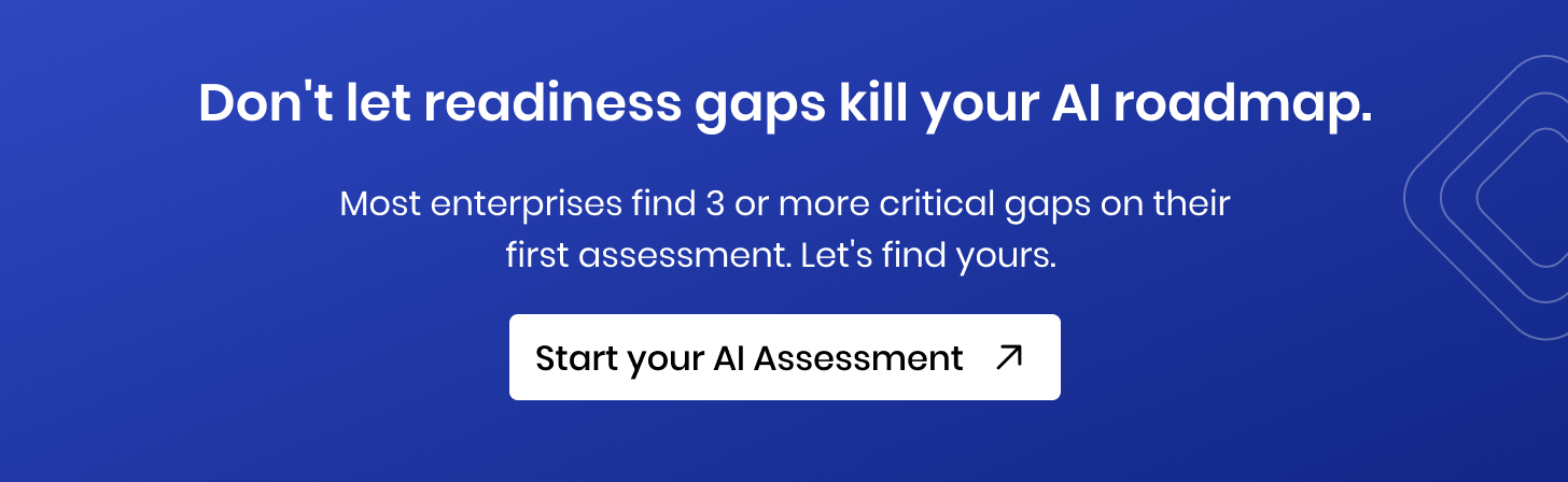 An AI readiness assessment is a structured diagnostic that evaluates whether your organization has the data quality, technology infrastructure, talent, governance, culture, and strategic alignment required to adopt AI at scale. For enterprises, it matters because it determines whether your AI investments will deliver measurable outcomes or consume resources without producing results. Most enterprise AI failures can be traced back to a readiness gap that was never formally identified.