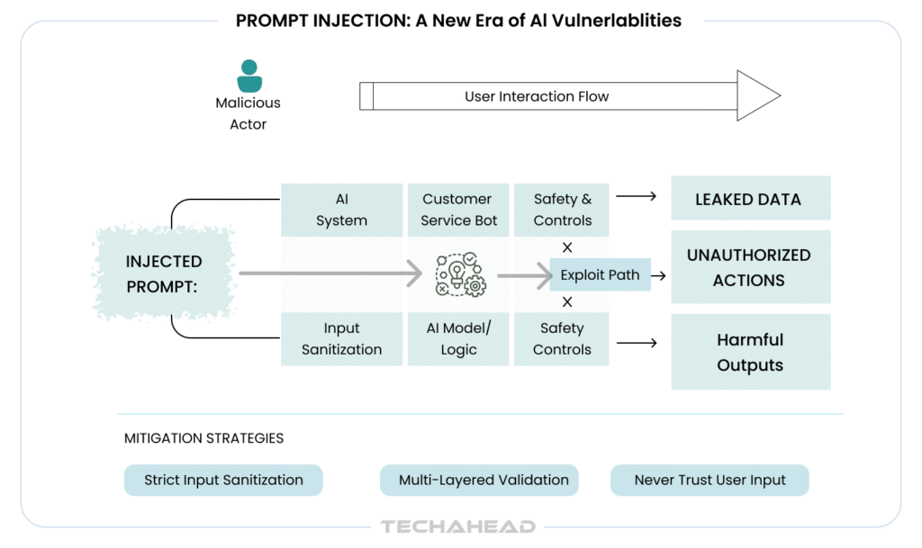 When users interact with your AI systems, they are essentially giving instructions. Prompt injection occurs when malicious actors craft inputs that override your AI’s original directives, causing it to ignore safety guidelines, leak sensitive data, or perform unauthorized actions.