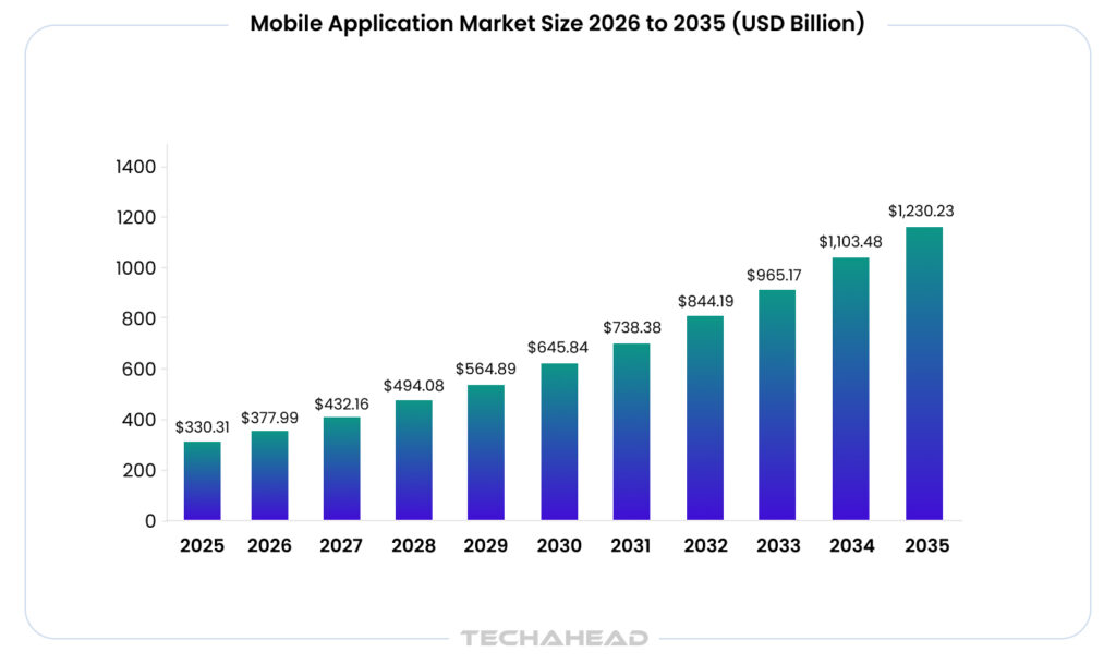 According to Precedence Research, the mobile app market hit $330.61 billion in 2025, and it is headed toward $1.23 trillion by 2035. That is a growth rate of 14% year over year.