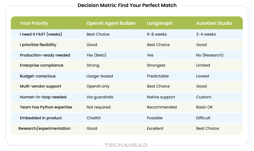 The choice between OpenAI Agent Builder, LangGraph, and AutoGen Studio isn’t about picking the “best” tool—it’s about selecting the right tool for your specific context.
