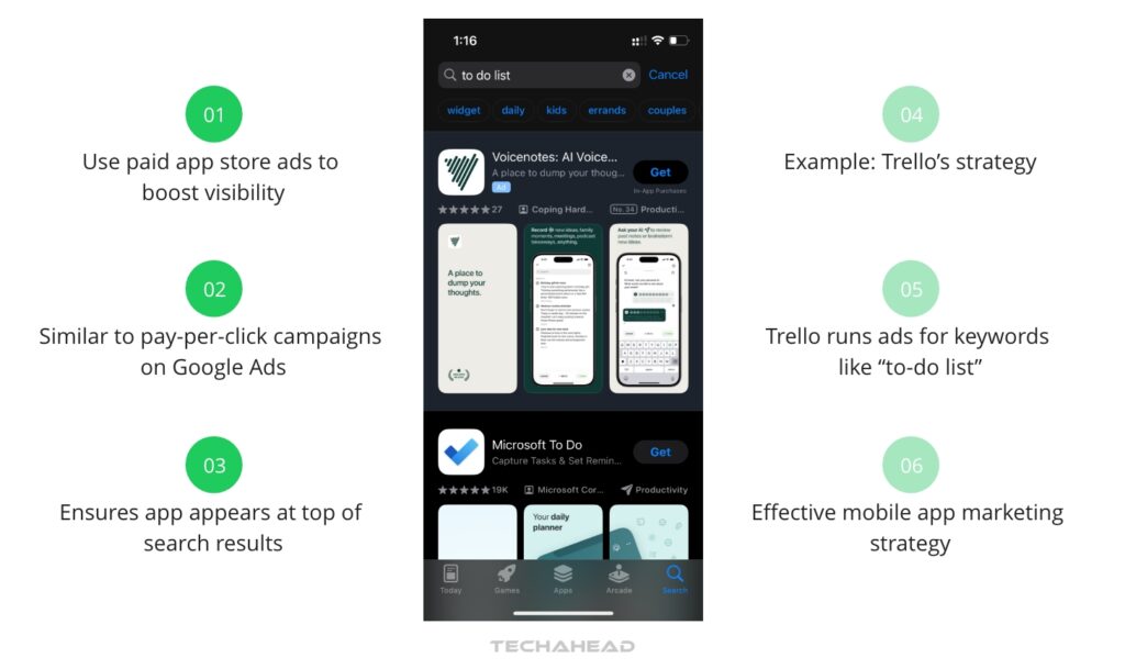 Boost your app’s visibility with paid app store ads, similar to pay-per-click campaigns on Google Ads. This mobile app marketing strategy ensures your app appears at the top of search results for relevant keywords. Let’s take an example, Trello runs app store ads for keywords like “to-do list.”