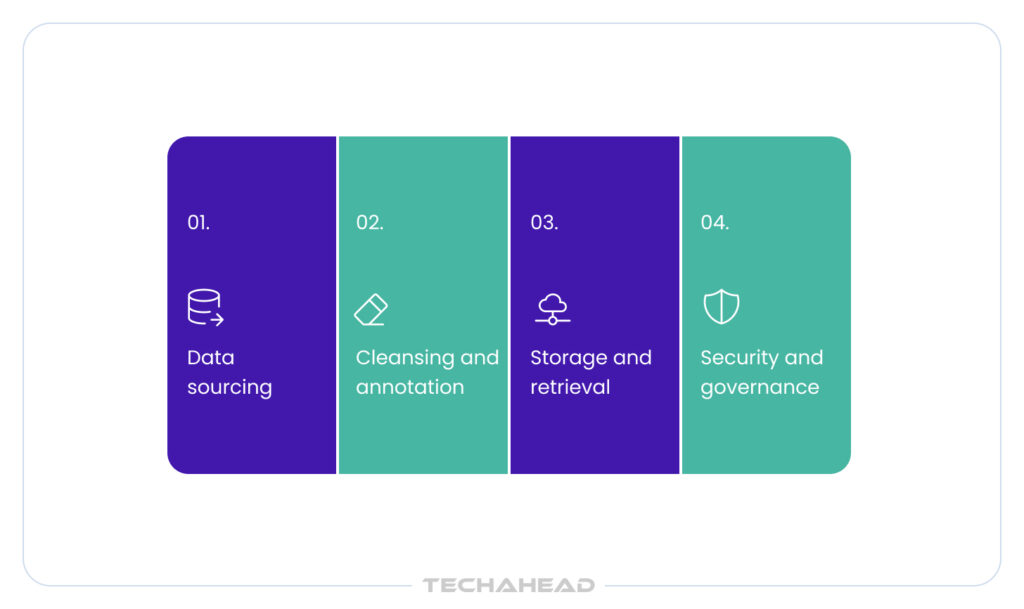 - Cleansing and annotation: Remove noise, label correctly, and ensure diversity.
