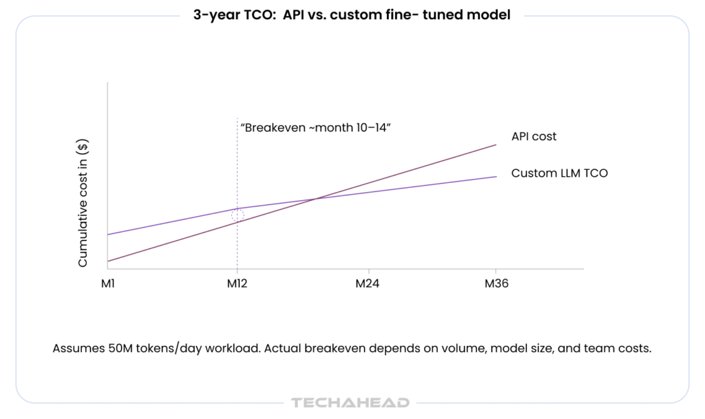 Build the 3-year TCO. Year one is always worst. By year three, the fine-tuned model has been retrained twice, the inference infrastructure is optimized, and the team has moved to a maintenance-only cadence. The 3-year all-in cost for a well-scoped fine-tuning project typically runs 30–40% of the equivalent API spend for the same workload volume.