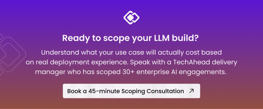 Offshore and hybrid team models reduce blended rates to $60–$120/hr. TechAhead’s 240-person team operates across U.S. and offshore engineering centers, allowing clients to access senior LLM architect oversight without full U.S. burdened headcount costs for the entire delivery team.