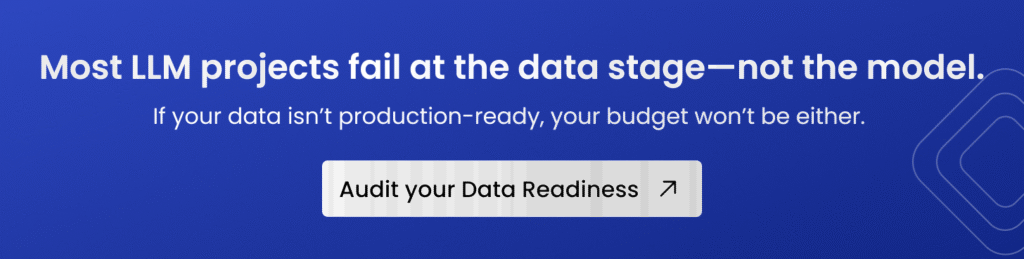 In our experience scoping LLM projects at enterprise scale, data preparation is the single most underestimated cost category. Clients who budget $50,000 for data routinely spend $150,000–$250,000 once the full scope becomes clear.