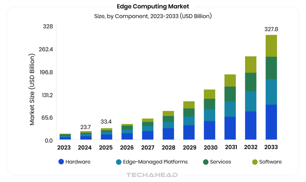 The edge refers to any computing that happens close to the data source on devices, sensors, factory floors, or local servers. Instead of sending raw data to a central cloud, the edge processes it instantly, on-site. The global edge computing market size was estimated at USD 23.65 billion in 2024 and is expected to reach USD 327.79 billion in 2033, growing at a CAGR of 33.0% from 2025 to 2033.
