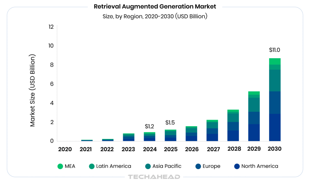 Grand View Research reports the global RAG market at USD 1.2 billion in 2024, projected to hit USD 11.0 billion by 2030 with a 49.1% CAGR from 2025 onward.