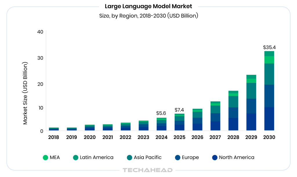 The global large language models market size was estimated at USD 5,617.4 million in 2024 and is projected to reach USD 35,434.4 million by 2030, growing at a CAGR of 36.9% from 2025 to 2030.