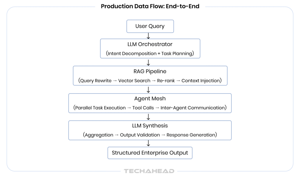 In production enterprise systems, RAG, LLMs, Multi-Agent Systems do not operate in silos; they form a tightly coupled reasoning or execution pipeline. Understanding how data flows across these layers is crucial for an implementation approach.