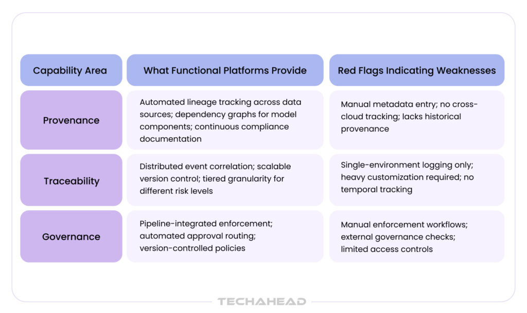 • Provenance requires automatic lineage capture, traceability needs cross-platform correlation, governance demands pipeline-integrated enforcement mechanisms