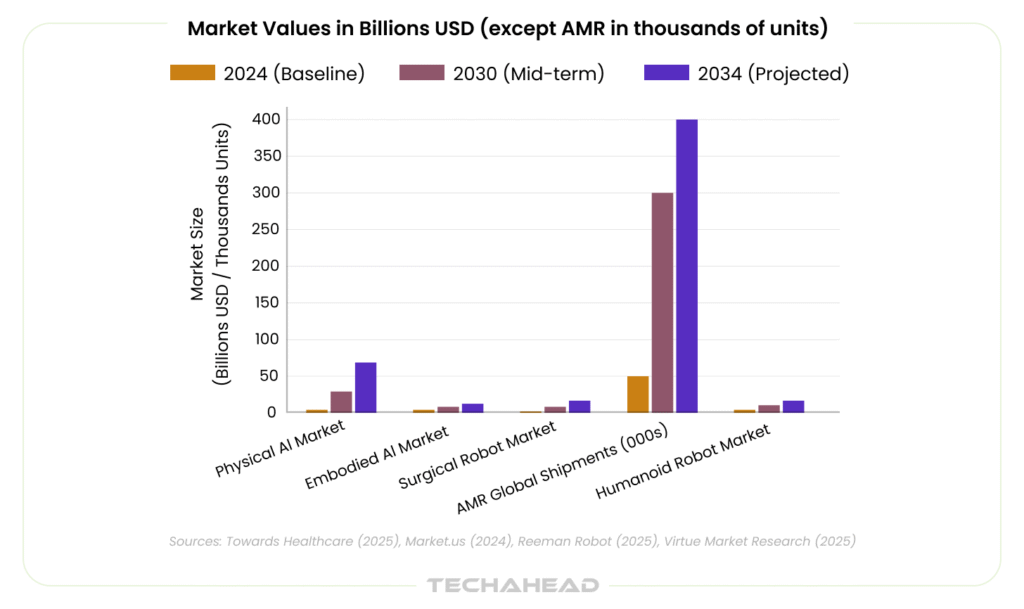 • Physical AI market explodes from $4.12B in 2024 to $61.19B by 2034