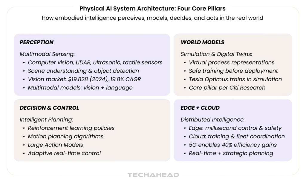 • Four pillars power embodied intelligence: perception, world models, decision, edge-cloud integration