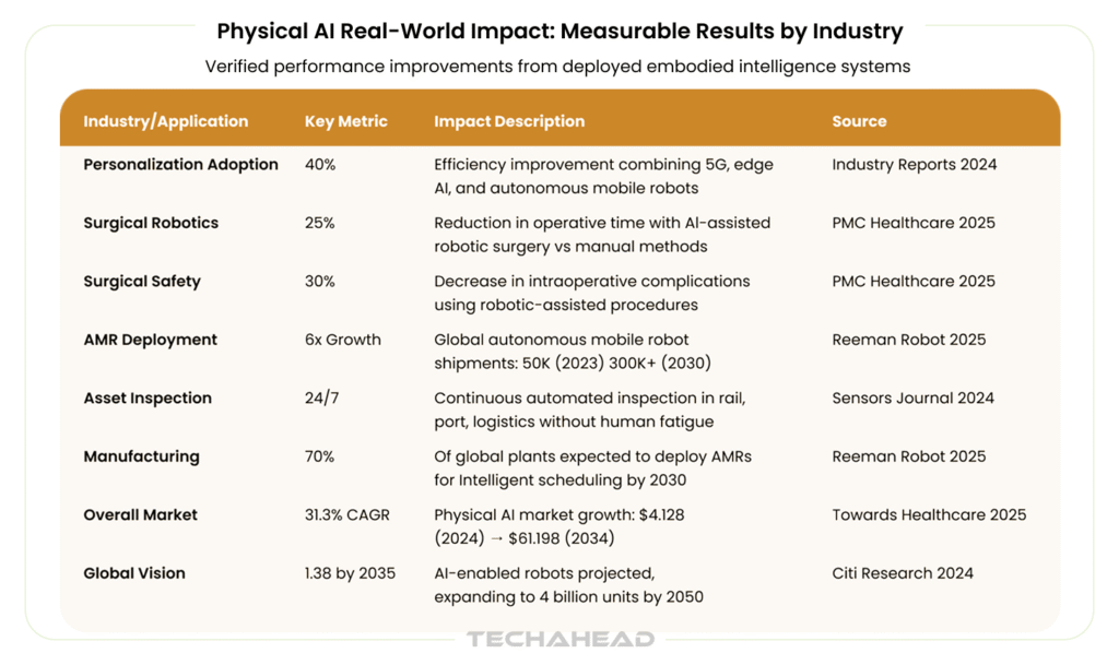 Manufacturing, healthcare (surgical robots), logistics and warehousing, smart cities, and infrastructure inspection see the highest Physical AI adoption.