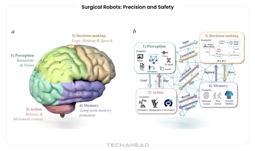 Recent advances in action-based AI and Large Action Models enable robots to translate high-level instructions into complex motor behaviors. For surgical robots, this means converting a surgeon’s intent into precise instrument motions. For warehouse robots, it means dynamically replanning routes when obstacles appear or priorities change.