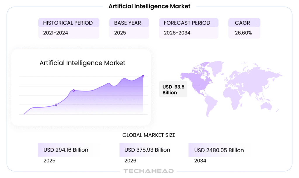 What if your AI investment became your biggest security liability? It happens more than you think. IBM reports that the average enterprise data breach now costs $4.88 million (2024), and AI systems, when poorly secured, can be an entirely new entry point into your business. At the same time, Gartner found that most AI projects fail to deliver the ROI leadership expected, almost always because budgets were guessed rather than planned. The global artificial intelligence market size is projected to grow from USD 375.93 billion in 2026 to USD 2480.05 billion by 2034, exhibiting a CAGR of 26.60% during the forecast period. So before you commit resources, you need a framework that protects your enterprise and your revenue. That is exactly what this 90-day AI roadmap gives you; financial clarity, security-first thinking, and a structured path to AI that actually delivers. Let’s dive in: