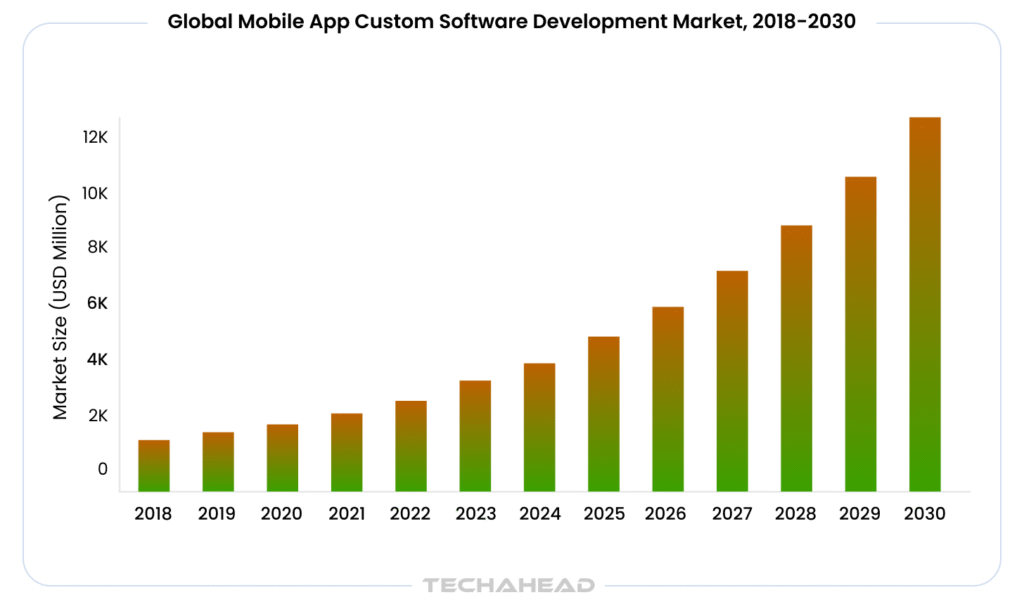 The global mobile app development market size was valued at US$ 4,113.0 million in 2024 and is estimated to grow at a compound annual growth rate (CAGR) of 20% from 2024 to 2030.