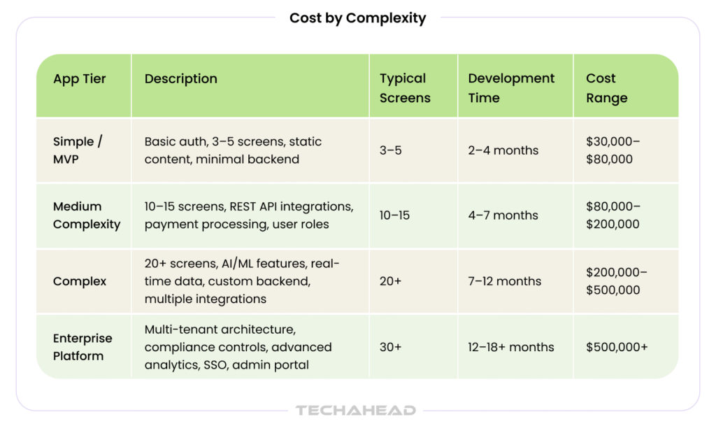 • MVP / Proof of Concept: $50,000–$100,000; three to five core screens, single platform, basic backend, four to six months to market
