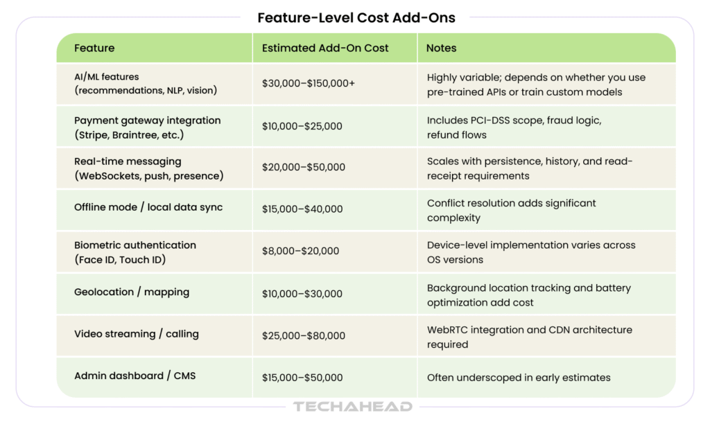 When scoping, list every feature your product requires and add the corresponding estimate. If your list includes AI recommendations, offline mode, and real-time messaging, that is $65K–$240K in feature add-ons alone before accounting for core screens and backend infrastructure.