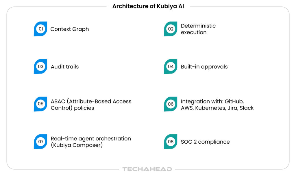 Kubiya AI specializes in DevOps-centered orchestration with a focus on contextual memory and zero-trust security. The platform addresses the unique challenges of infrastructure automation, where agents must navigate complex cloud environments, manage state across distributed systems, and enforce security policies at every step.