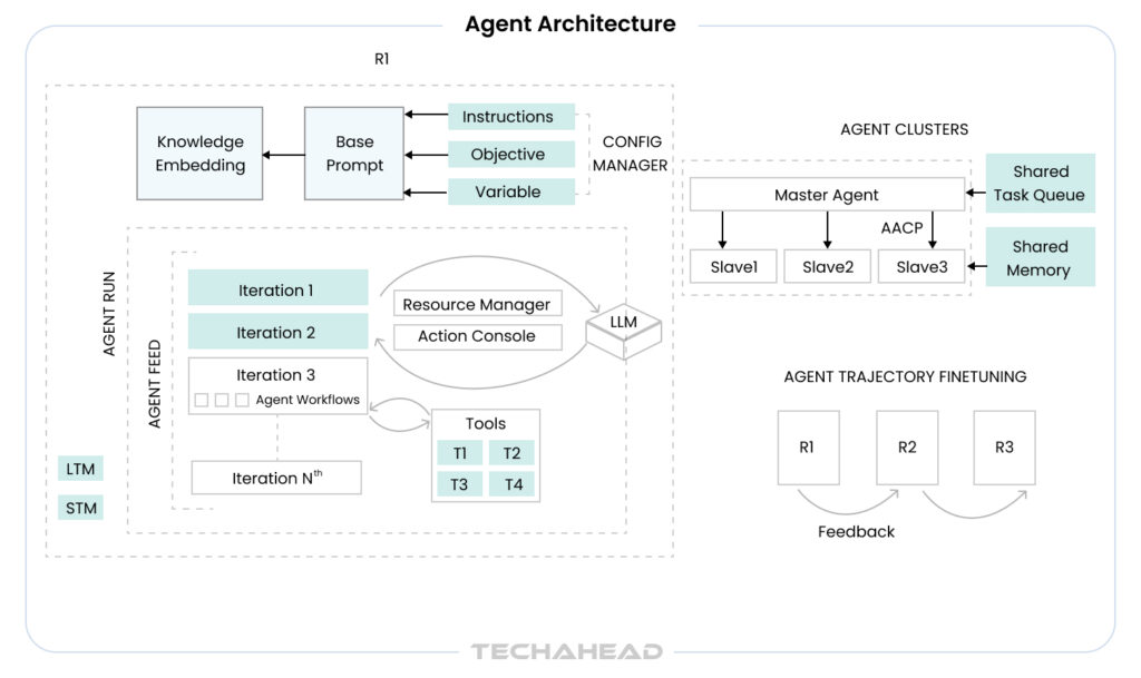 • Feedback Loop: Once the appropriate agents are assigned the tasks, the feedback loop element monitors the agent’s output, validates the results as per the expected outcomes, and empowers the agents to learn, re-learn, and understand what is success and what is a failure, to expand their worldview. A form of reinforcement mechanism is deployed here.