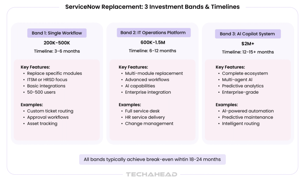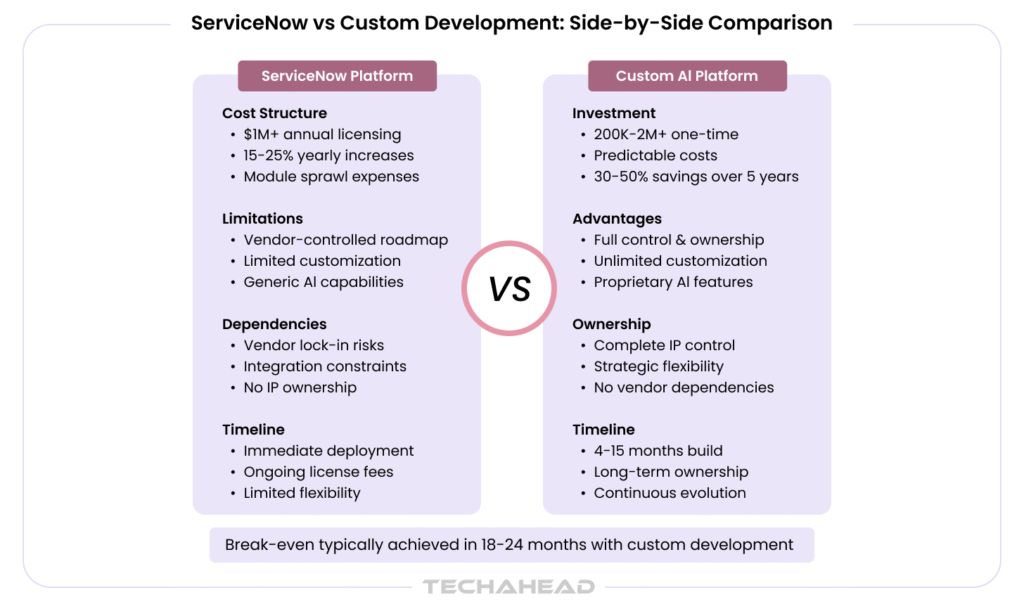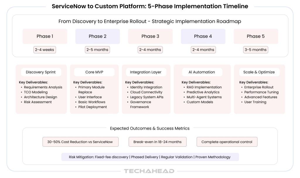 Timeline and Strategic Impact: Implementation requires 12-15+ months with sophisticated project management and change management strategies. These investments create owned intellectual property that provides foundation for ongoing innovation, competitive differentiation, and strategic agility while delivering substantial cost savings compared to equivalent ServiceNow licensing.