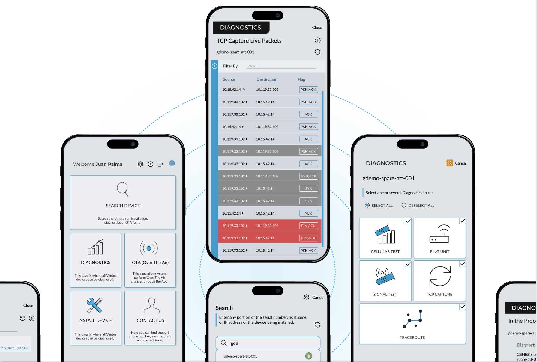 Ventus Networks required a comprehensive web-based monitoring platform to manage their extensive portfolio of cellular and IoT devices across multiple geographic locations. The challenge involved creating a unified interface that could handle real-time diagnostics, network monitoring, device management, and customer support ticketing.